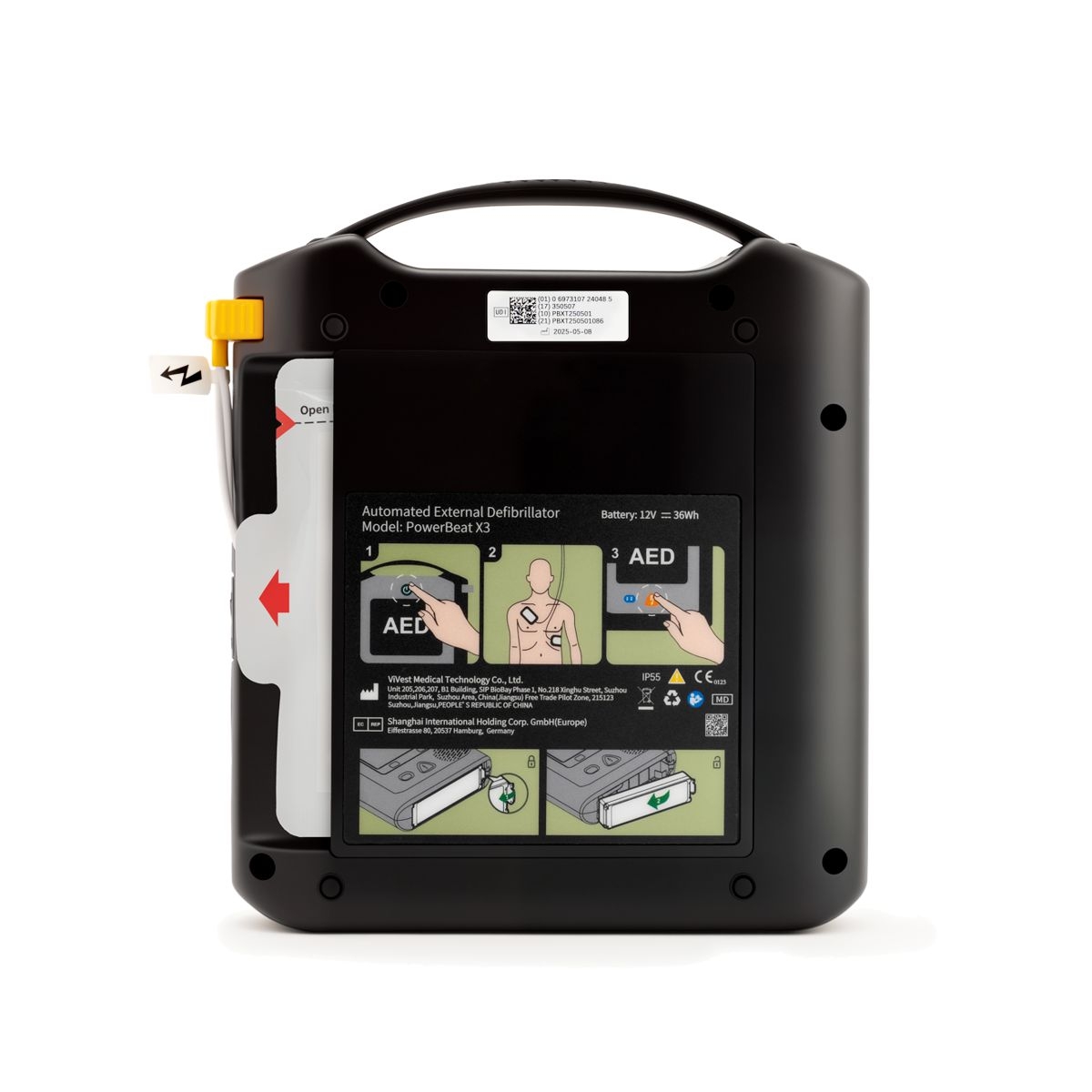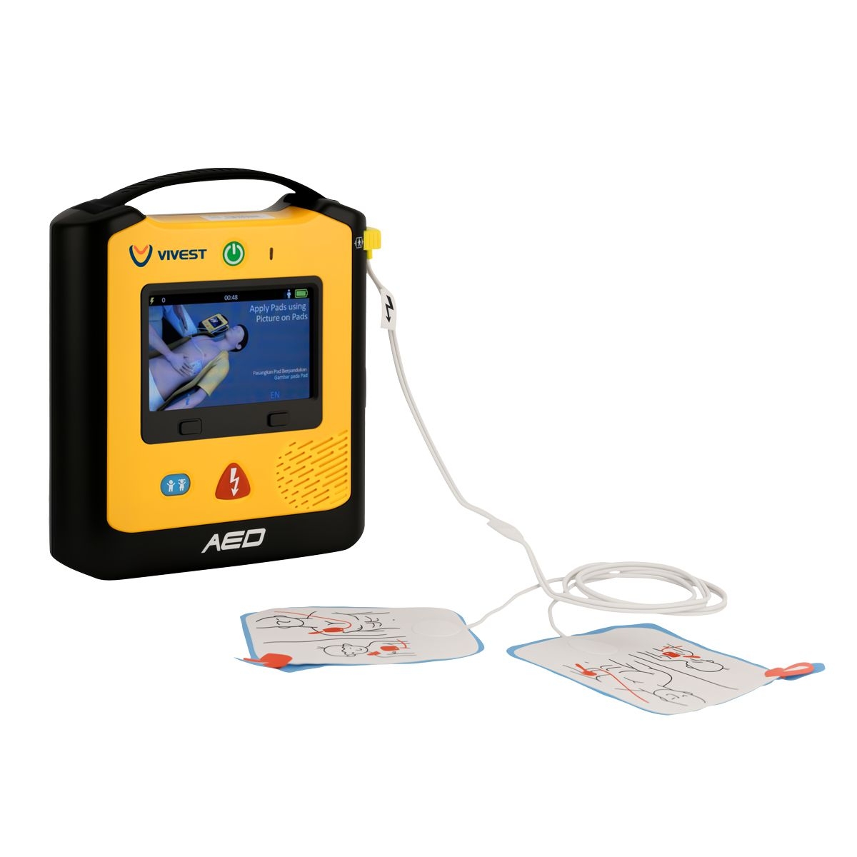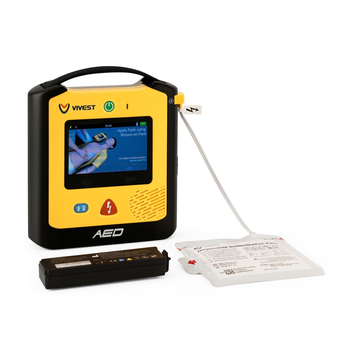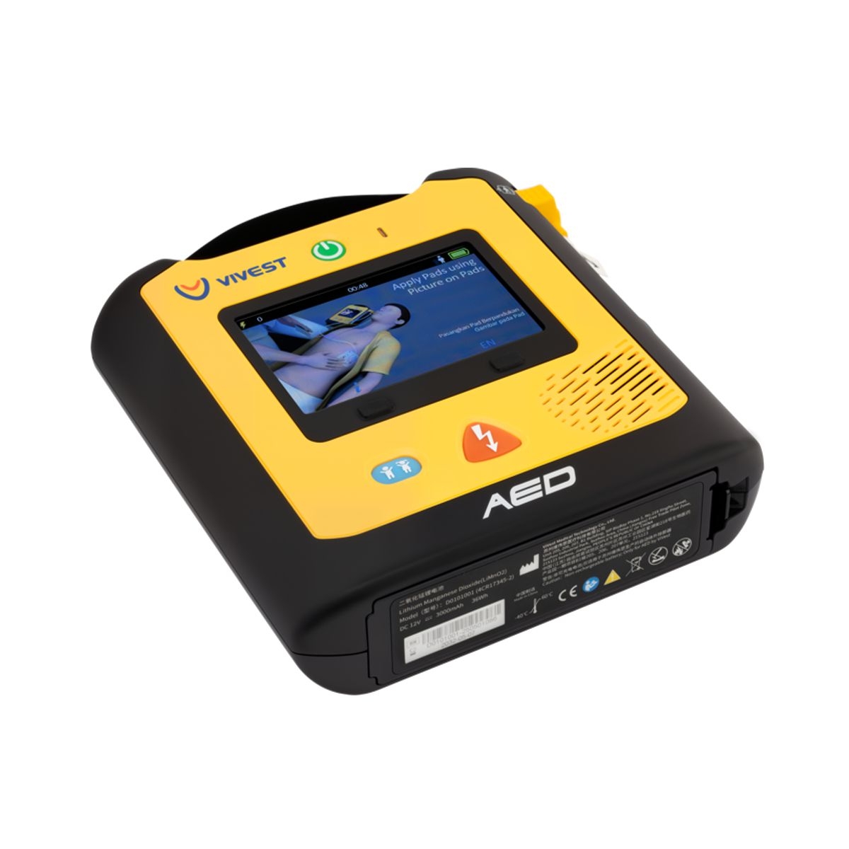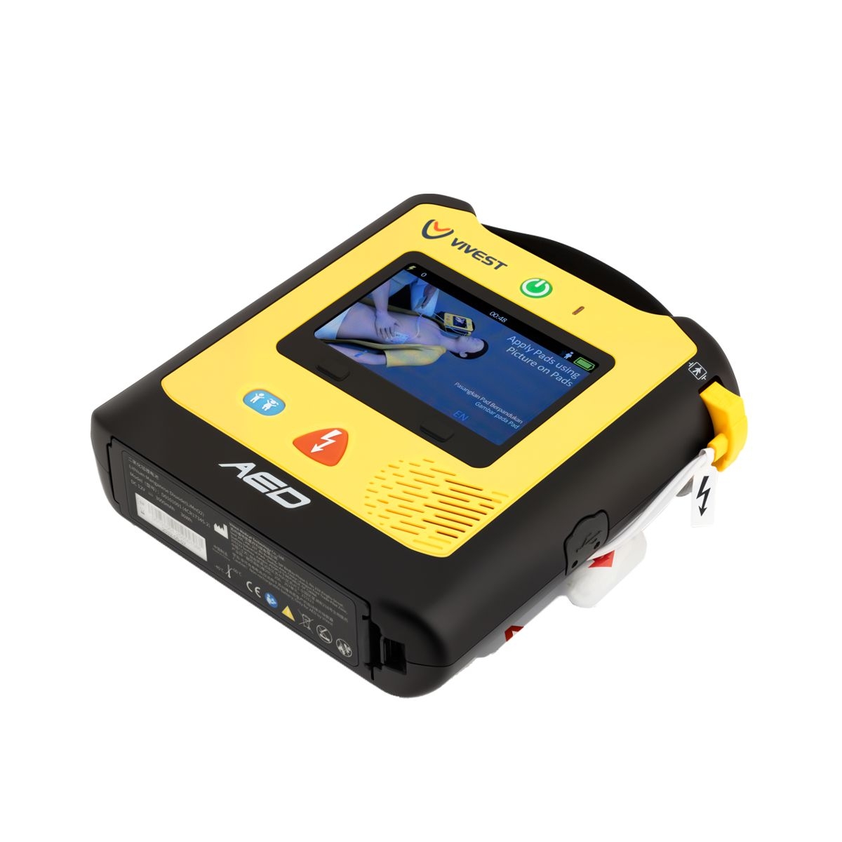 Defibrylator półautomatyczny Vivest PowerBeat X3 z kolorowym ekranem LCD, oferujący wizualne i głosowe instrukcje w czasie rzeczywistym. Urządzenie wspiera ratowników w prowadzeniu skutecznej resuscytacji krążeniowo-oddechowej, zgodnie z wytycznymi AHA 2020.