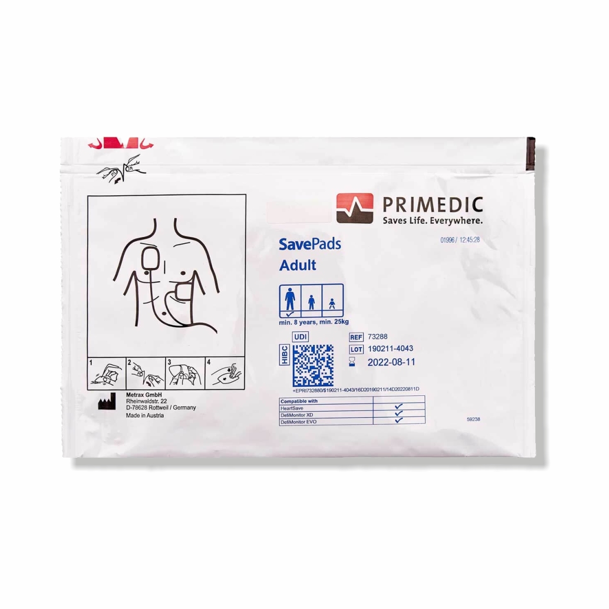 Elektrody SavePads-Set przeznaczone do defibrylacji osób dorosłych. Elektrody przykleja się w pozycji przód-przód. Instrukcja jak przymocować poprawnie elektrody do pacjenta znajduje się na opakowaniu, a także na każdej z elektrod.