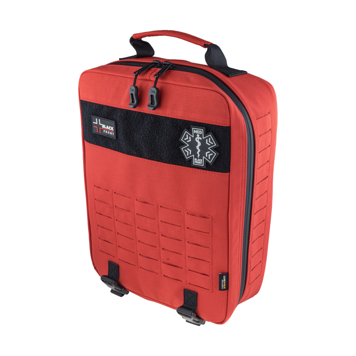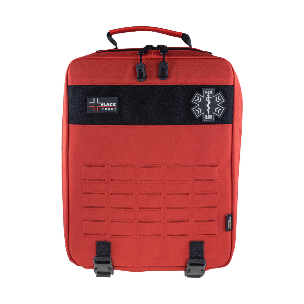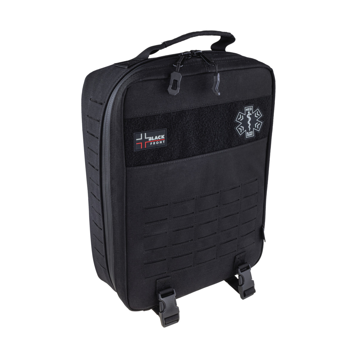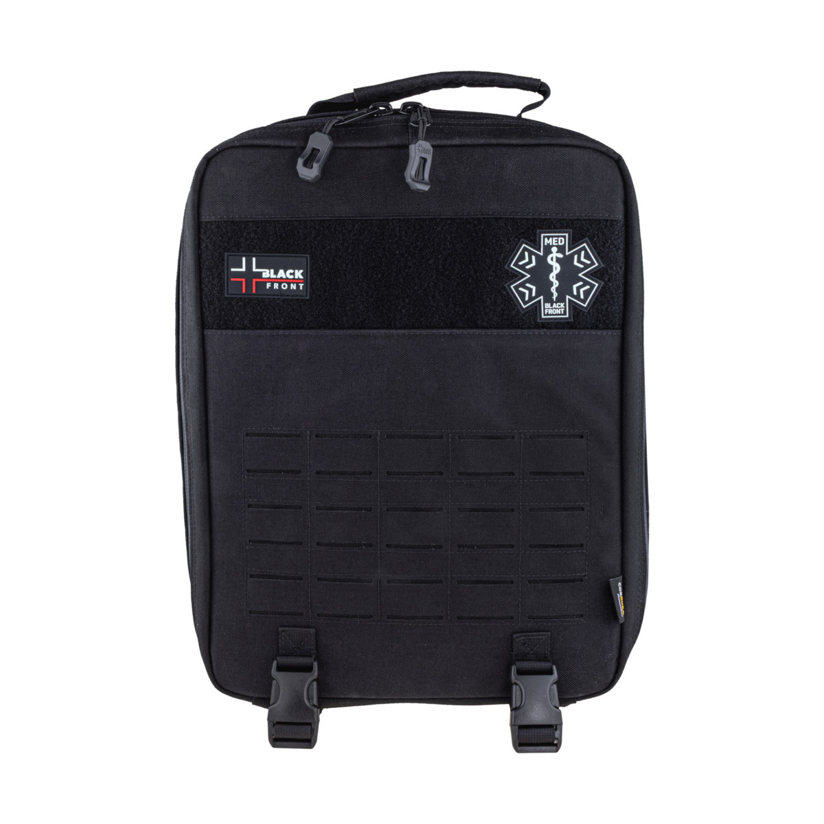 Plecak SBTR GEN2 jest elementem systemu Trauma Responder marki Black Front i może pracować samodzielnie lub w zestawie z: LBTR (duży plecak), TR (duża saszetka) oraz PTR (mała saszetka osobista). Montaż odbywa się w standardzie PALS/MOLLE z Laser Cut, co pozwala swobodnie skalować konfigurację.