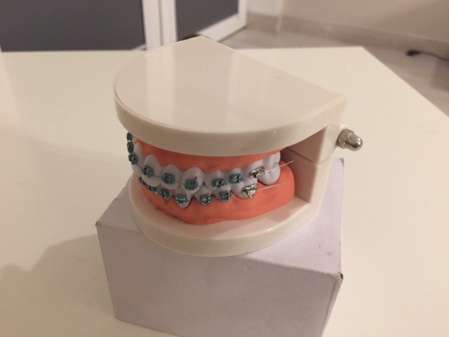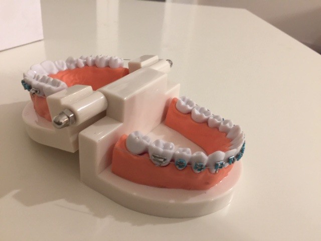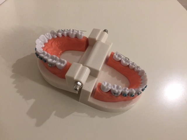 • zamontowany aparat ortodontyczny umożliwiający prezentację działania i korekcji zgryzu,