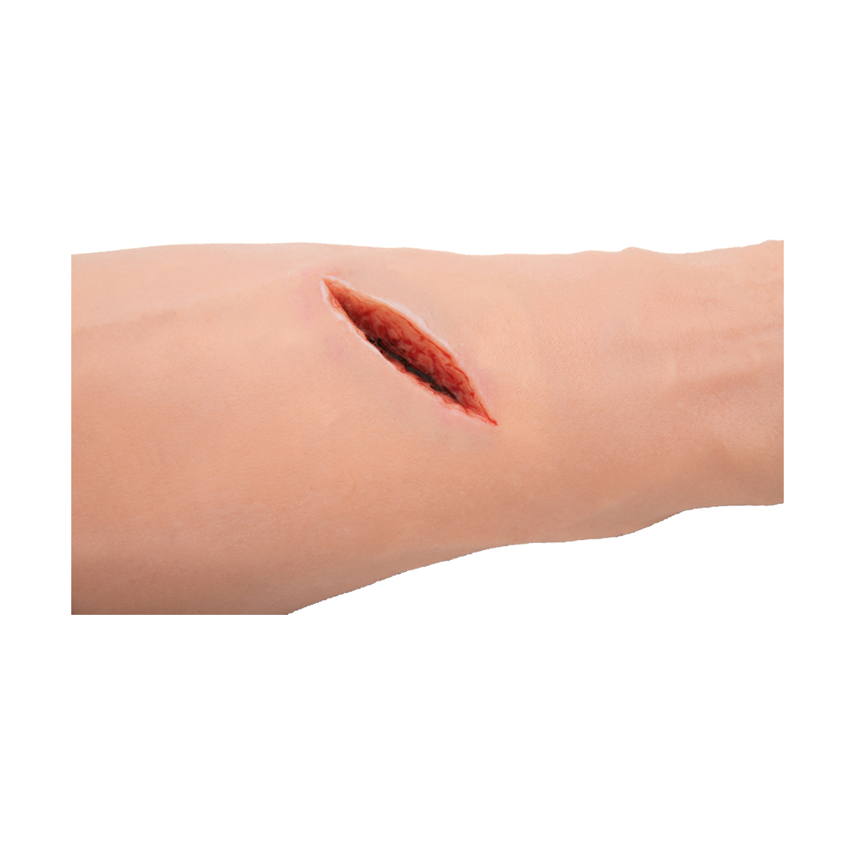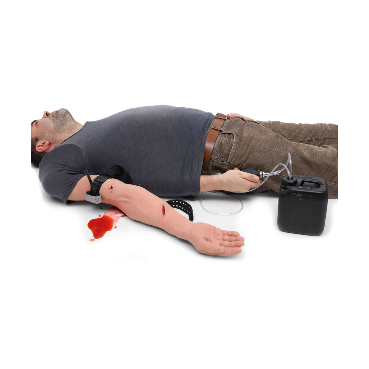 Trenażer do nauki tamowania krwotoku na kończynie górnej z realistyczną symulacją krwawień i ran. Symulator umożliwia trening m.in.: zakładania opaski uciskowej czy opatrywania rany za pomocą gazy zrolowanej lub opatrunku uciskowego.